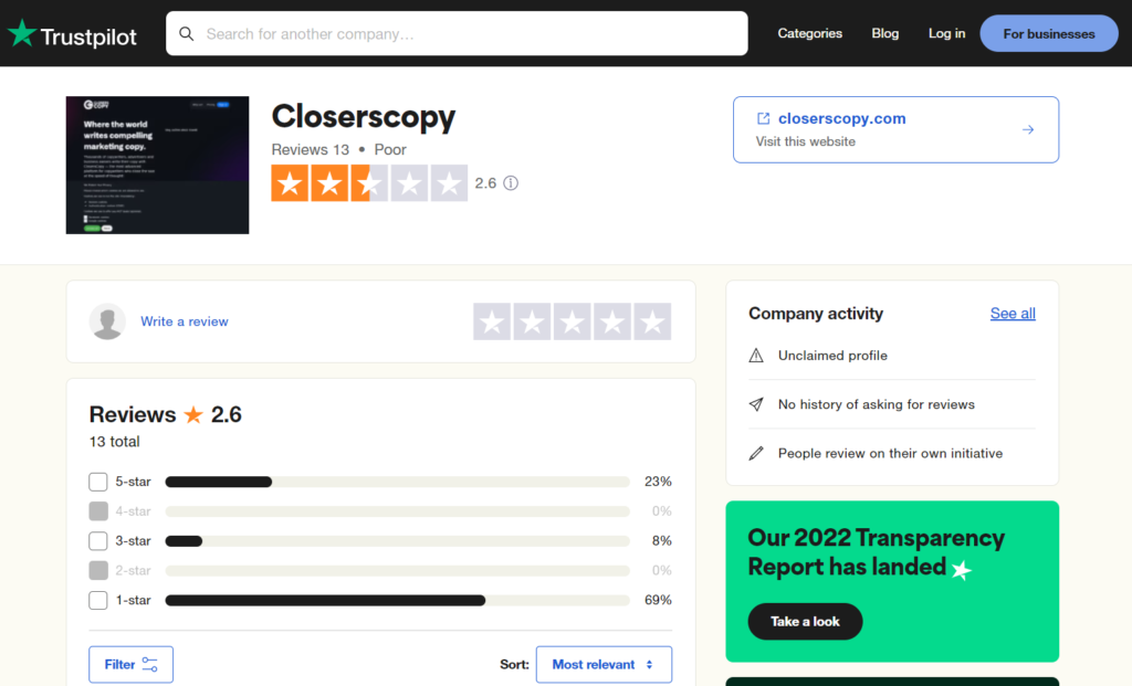 Trustpilot’s average rating for Closerscopy is 2.6 stars. There are 13 reviews with one 3-star rating, nine 1-star ratings, and three 5-star ratings. Thus, there isn’t much information on which to base the decision.