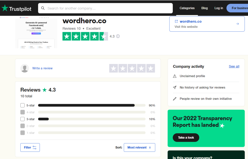Word hero has a 4.3 rating on the Trustpilot platform with 9 reviews. It has eight 5-star ratings and one 3-star rating.