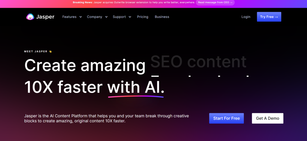 Jarvis is One of the top artificial intelligence (AI) tools for copywriting; it facilitates the creation of content quickly. Their homepage describes the tool as “your AI writing helper that makes it fast & easy to write content for your blog, social media posts, landing pages, web pages, and more,” with a primary focus on marketing copy (which includes blog articles).