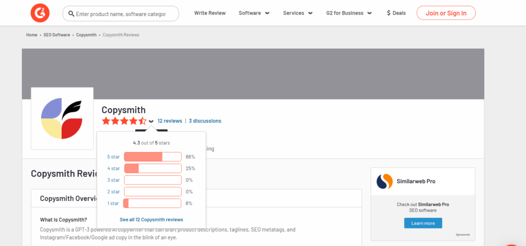 Trustpilot’s average rating for Copysmith is 2.7 stars. There are four reviews in total, with one 5-star and three 1-star ratings. Thus, there isn’t much information on which to base decisions.