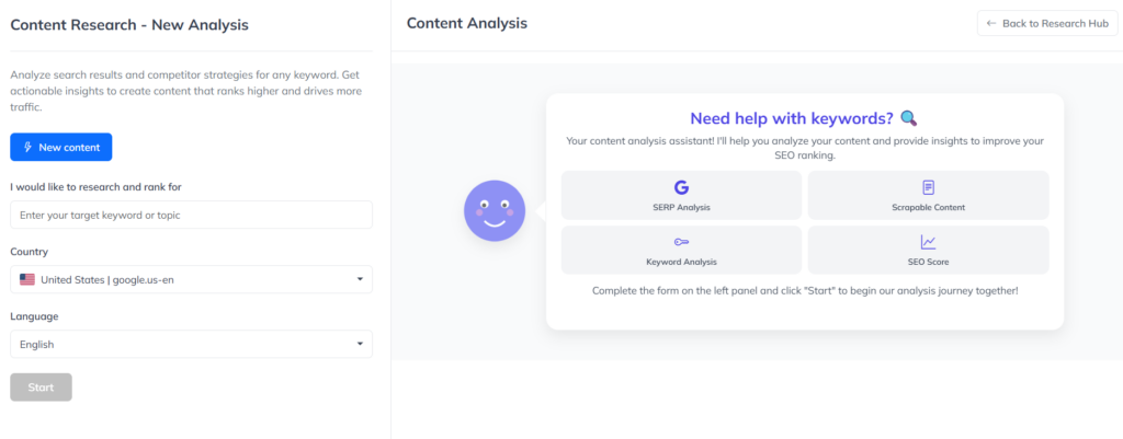 Once you go through the findings, click Start Writing Article to access the SEO Editor. You are placed inside a writing space, where:
