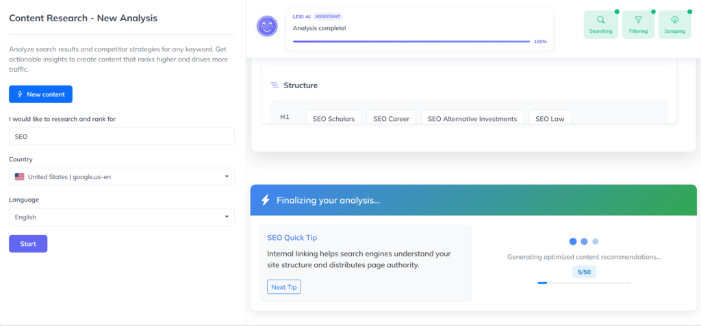 After starting the research, Lexi AI analyses the top-ranking Google pages, which usually takes a few minutes. During this process,