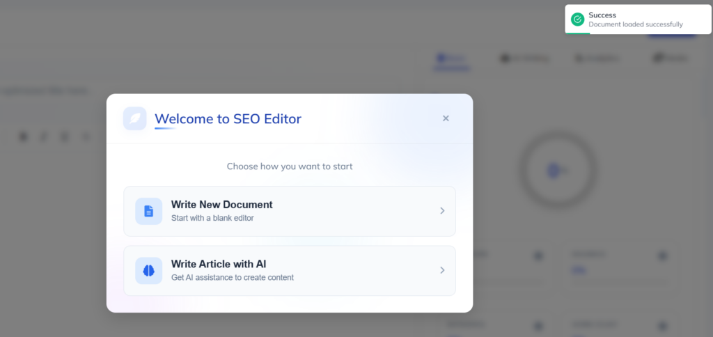 When your research is done and your outline is ready, the SEO Editor then leads you into the drafting stage in an assisted workflow. When you are in the editor, the first page is “Welcome to SEO Editor” with the following two options: