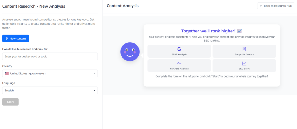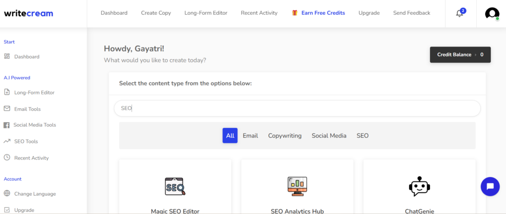 The dashboard of Writecream simplifies SEO optimisation by: