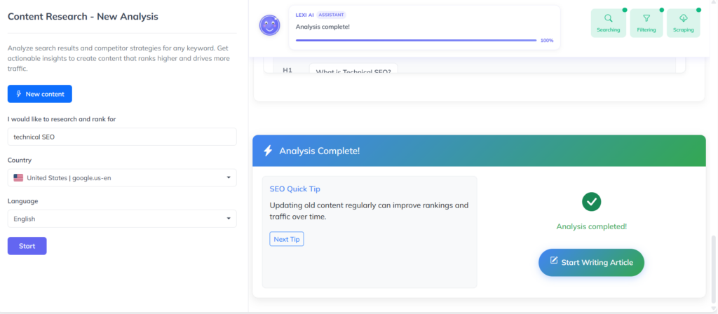 The problem is that even the best-written news stories can fail to rank if there are issues on the technical front or if the on-page factors are not optimised. This is where the importance of a technical SEO audit and on-page optimisation comes into the picture. This can now be done more effectively using tools like the SEO Editor on Writecream’s AI agent Lexi AI.
