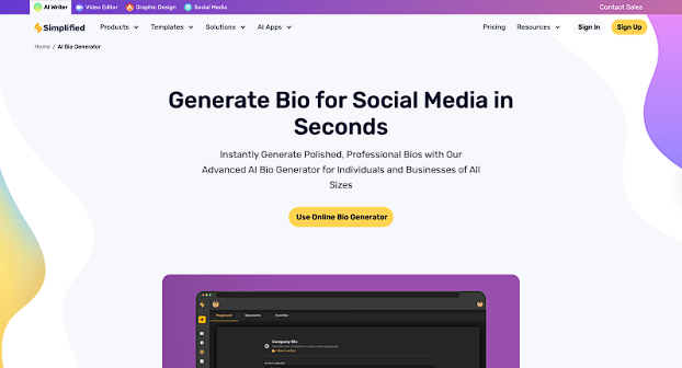 Simplified is an all-in-one creative suite that treats the social media bio as one part of a larger brand identity. Because it integrates with design and video tools, you can instantly turn your new captivating bio into a LinkedIn banner or a social media graphic.