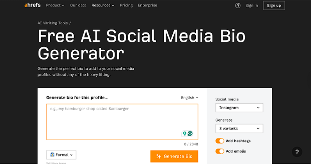 Part of the Ahrefs free writing suite, this tool is surprisingly sophisticated for a free utility. It allows you to select your target platform, whether it’s TikTok, LinkedIn, or Instagram, and it adjusts the character count and “vibe” accordingly.